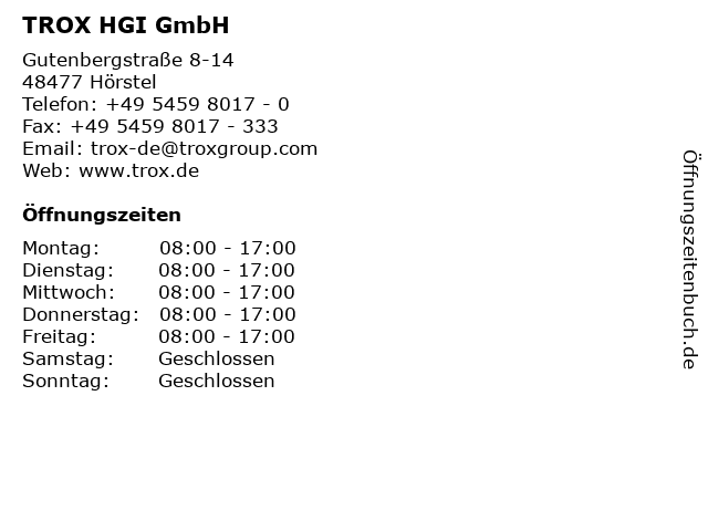 | Öffnungszeiten TROX HGI GmbH in Hörstel anzeigen | |