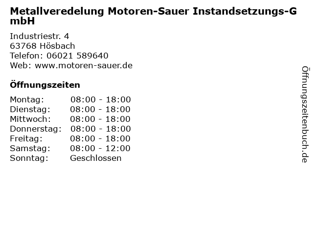 1 Hydraulikzylinder Motoren-Sauer Instandsetzungs-GmbH (Entfernung: 0,00 km) Industriestr. 4, 63768 Hösbach 3 Motoreninstandsetzung Motoren-Sauer Instandsetzungs-GmbH (Entfernung: 0,00 km) Industriestr. 4, 63768 Hösbach 4 6 |