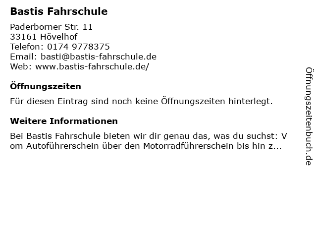 | Öffnungszeiten Bastis Fahrschule in Hövelhof anzeigen | |