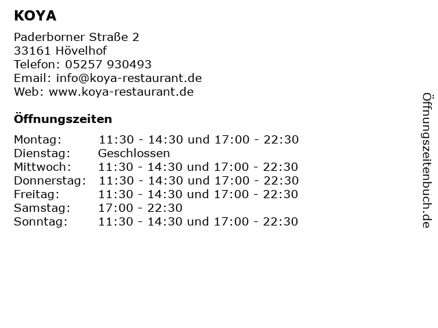 | Öffnungszeiten KOYA in Hövelhof anzeigen | |