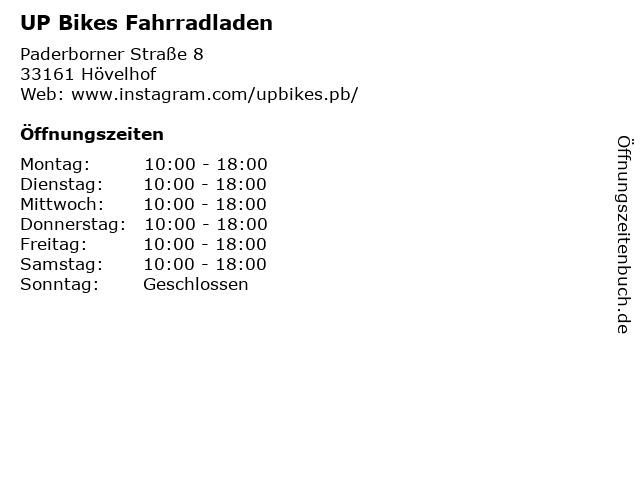 | Öffnungszeiten UP Bikes Fahrradladen in Hövelhof anzeigen | |