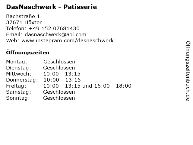 | Öffnungszeiten DasNaschwerk - Patisserie in Höxter anzeigen | |