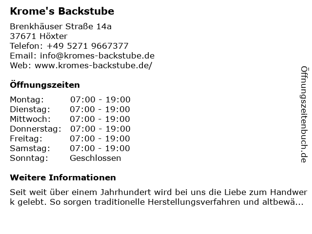 | Öffnungszeiten Krome's Backstube in Höxter anzeigen | |