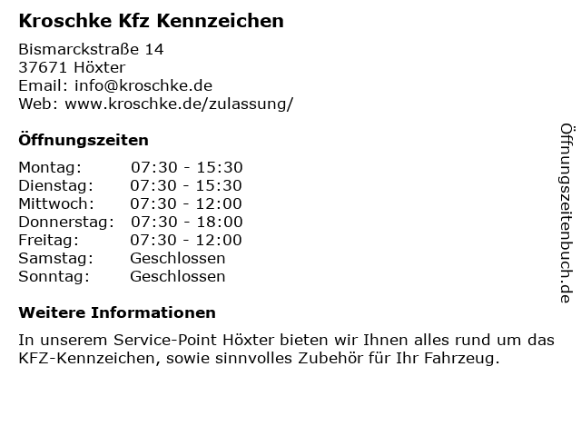 | Öffnungszeiten Kroschke Kfz Kennzeichen in Höxter anzeigen | |