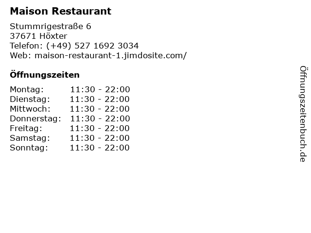| Öffnungszeiten Maison Restaurant in Höxter anzeigen | |