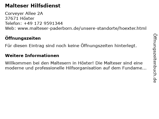 | Öffnungszeiten Malteser Hilfsdienst in Höxter anzeigen | |