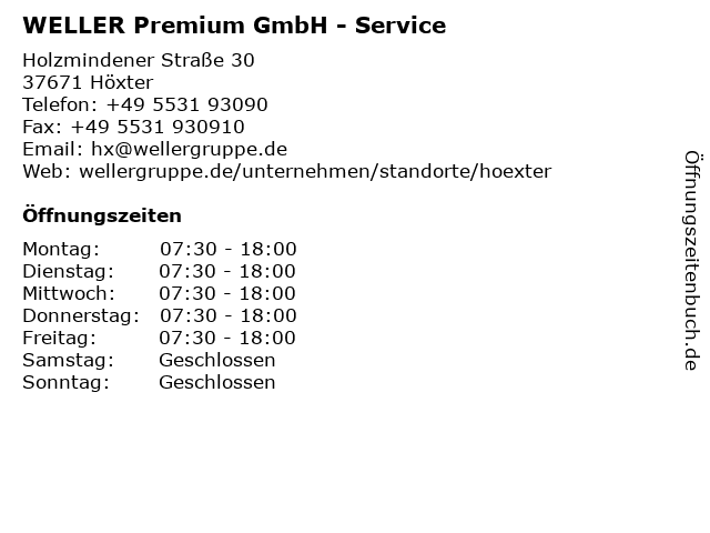 | Öffnungszeiten WELLER Premium GmbH - Service in Höxter anzeigen | |