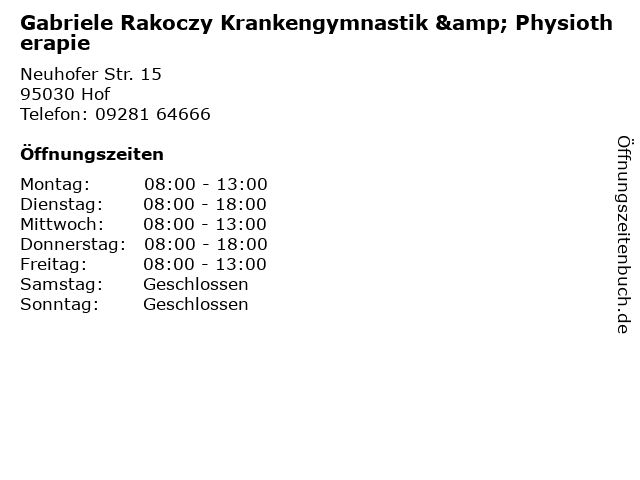 2 Krankengymnastik Therapiehaus Uhlmann-Zeitler F. (Entfernung: 2,87 km) Eppenreuther Straße 44a, 95032 Hof 3 6 |