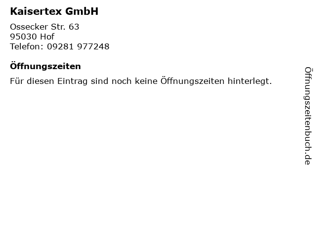 | Öffnungszeiten Kaisertex GmbH in Hof anzeigen | |
