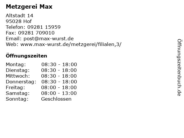 | Öffnungszeiten Metzgerei Max in Hof anzeigen | |