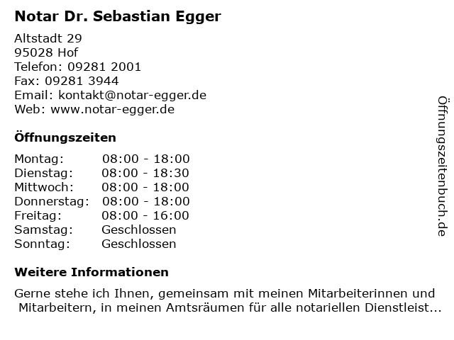 | Öffnungszeiten Notar Dr. Sebastian Egger in Hof anzeigen | |