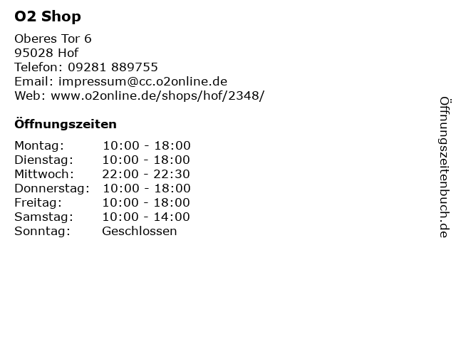 | Öffnungszeiten O2 Shop in Hof anzeigen | |