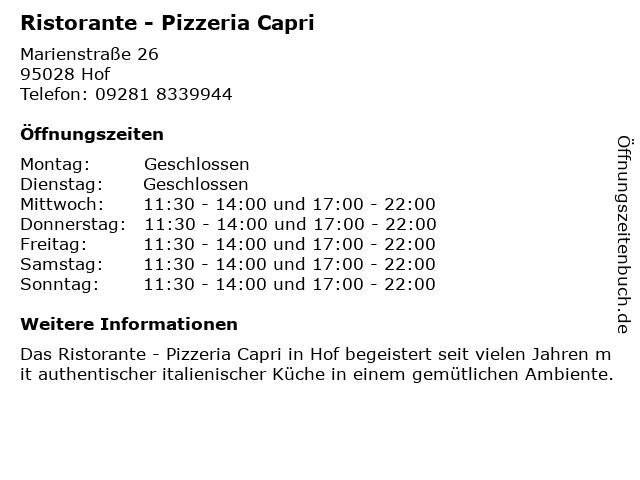 | Öffnungszeiten Ristorante - Pizzeria Capri in Hof anzeigen | |