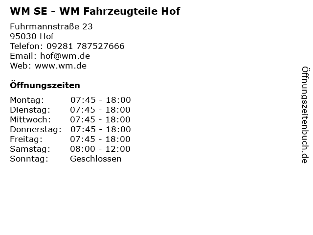 | Öffnungszeiten WM SE - WM Fahrzeugteile Hof in Hof anzeigen | |