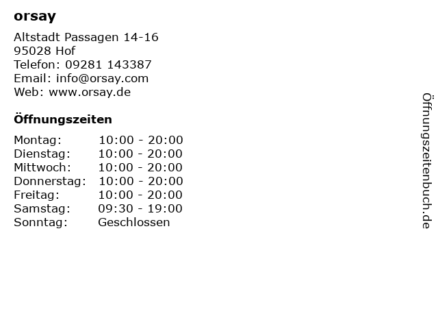 | Öffnungszeiten orsay in Hof anzeigen | |
