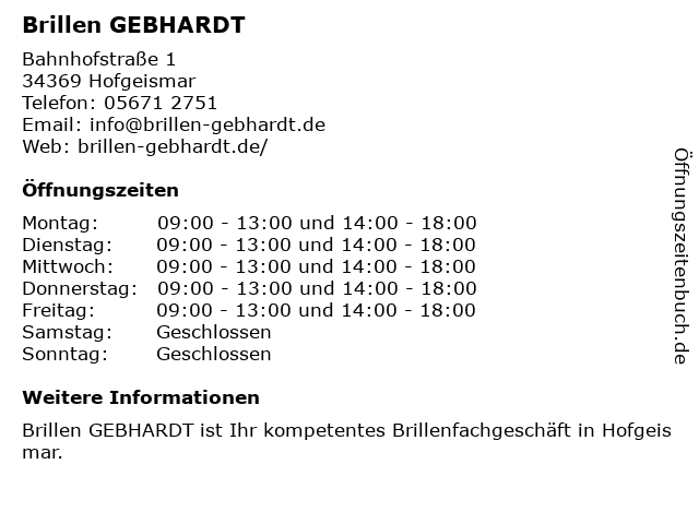 | Öffnungszeiten Brillen GEBHARDT in Hofgeismar anzeigen | |