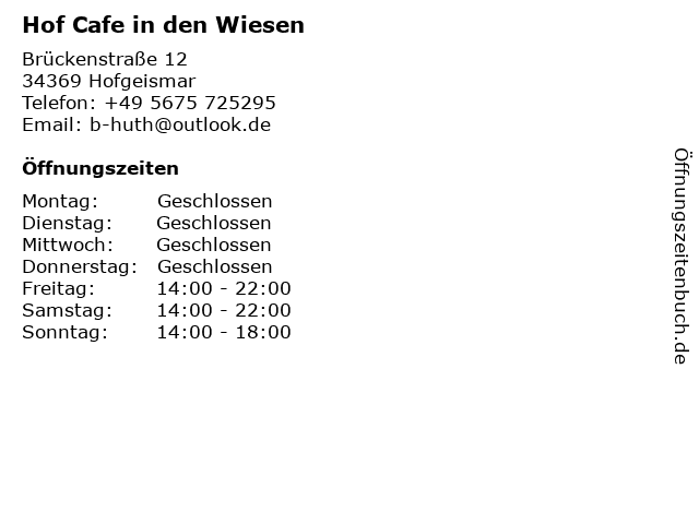 | Telefonnummer Hof Cafe in den Wiesen in Hofgeismar (+49 5675 725295) anrufen | |