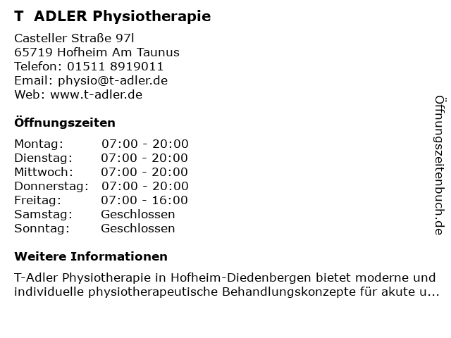 Branchen & Suchbegriffe zu T ADLER Physiotherapie:adler, alternative heilmethoden, biofeedback-therapie, massagetherapie, massagezentrum, physiotherapie |