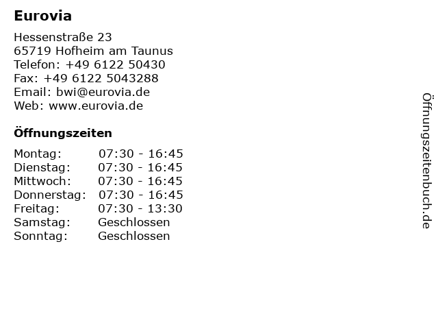| Öffnungszeiten Eurovia in Hofheim am Taunus anzeigen | |