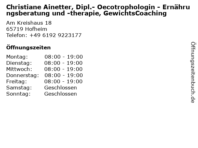 1 Praxis für Paar- und Individualberatung Christiane Boehm (Entfernung: 1,35 km) Feldstraße 1, 65719 Hofheim am Taunus 2 Heino Bornemann, Inge Schmollinger-Bornemann Shiatsu u. Ernährungsberatung (Entfernung: 6,27 km) Pfarrgasse 41 A, 65239 Hochheim 3 Dr. Christiane Schmitz-Brendel - Fachärztin für Innere Medizin (Entfernung: 7,40 km) Hornauer Str. 92, 65779 Kelkheim 4 Tanja Kratzberg Training, Fitness, Caching & Personalisierte Ernährungsberatung (Entfernung: 8,99 km) Am Wiesenhang 30B, 65207 Wiesbaden 5 Ernährungsberatung, BCM Dr. Michaela Speth-Nitschke (Entfernung: 9,10 km) Walter-Flex-Str. 121, 65428 Rüsselsheim 6 AthletiXX Personaltraining & Ernährungsberatung (Entfernung: 9,61 km) Wilhelm-Kobelt-Straße 30, 60529 Frankfurt am Main |