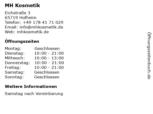 | Öffnungszeiten MH Kosmetik in Hofheim anzeigen | |