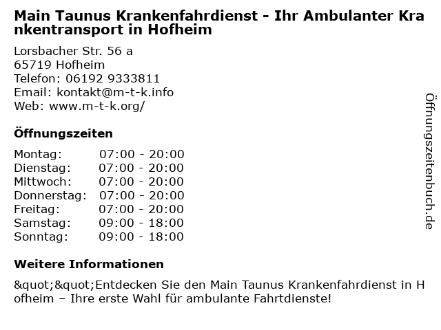 Öffnungszeiten Main Taunus Krankenfahrdienst - Ihr Ambulanter Krankentransport in Hofheim