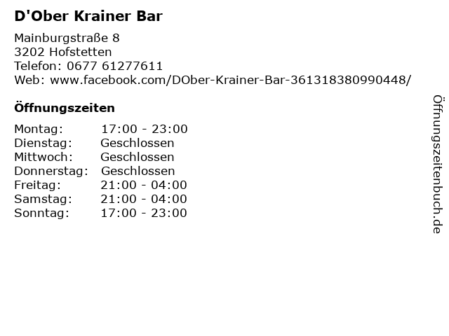 | Öffnungszeiten D'Ober Krainer Bar in Hofstetten anzeigen | |