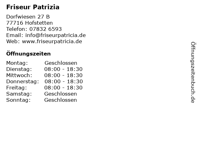 | Öffnungszeiten Friseur Patrizia in Hofstetten anzeigen | |