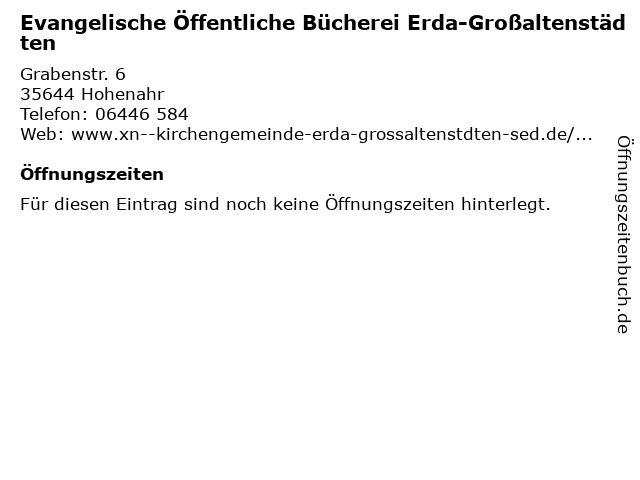 | Evangelische Öffentliche Bücherei Erda-Großaltenstädten anrufen | |