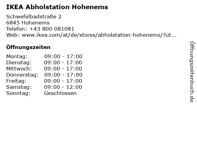 | Öffnungszeiten IKEA Abholstation Hohenems in Hohenems anzeigen | |