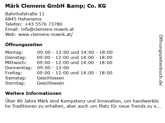 | Öffnungszeiten Märk Clemens GmbH & Co. KG in Hohenems anzeigen | |