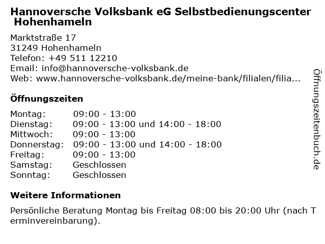 Branchen & Suchbegriffe zu Hannoversche Volksbank eG Selbstbedienungscenter Hohenhameln:bank, eg, geldautomat, hannoversche, hohenhameln, kreditgenossenschaft, selbstbedienungscenter, volksbank |