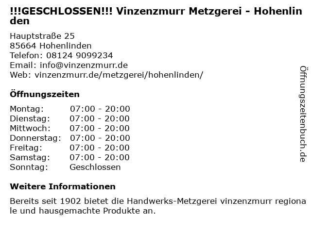 Branchen & Suchbegriffe zu !!!GESCHLOSSEN!!! Vinzenzmurr Metzgerei - Hohenlinden:!!!geschlossen!!!, delikatessenhandel, hohenlinden, käseladen, metzgerei, vinzenzmurr |