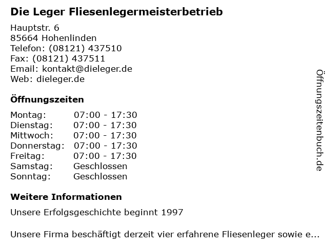 1 Christian Krug Fliesenlegermeisterbetrieb (Entfernung: 1,40 km) Hohenlindener Str. 5 A, 85659 Forstern 2 Rainer Gregoritza Fliesenlegermeisterbetrieb (Entfernung: 10,95 km) Staudhamer Str. 31, 85570 Markt Schwaben 3 Westermeier Gebr. GmbH Fliesenlegermeisterbetrieb (Entfernung: 19,33 km) Habichtweg 31, 85464 Finsing 6 |