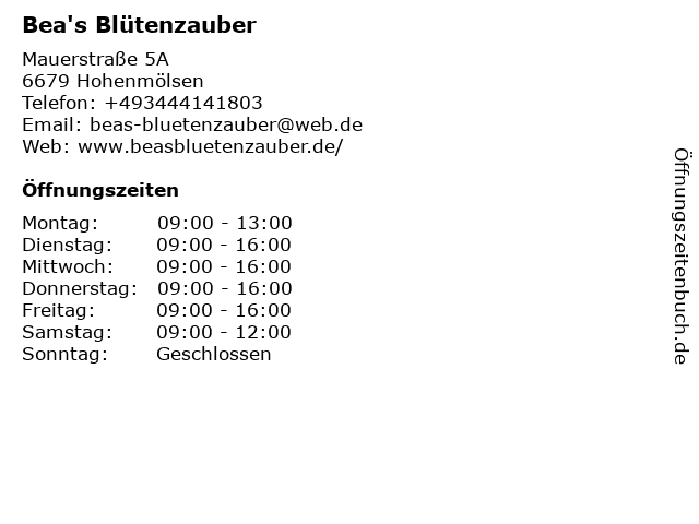 | Öffnungszeiten Bea's Blütenzauber in Hohenmölsen anzeigen | |