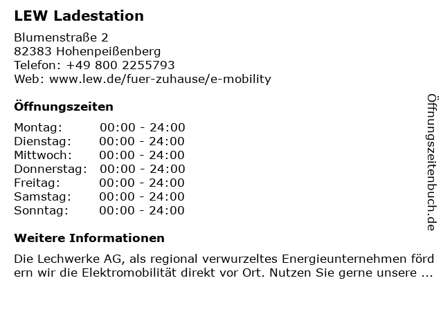 | Öffnungszeiten LEW Ladestation in Hohenpeißenberg anzeigen | |
