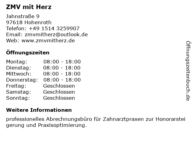 | Öffnungszeiten ZMV mit Herz in Hohenroth anzeigen | |