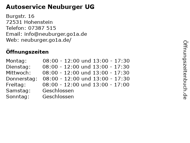 | Öffnungszeiten Autoservice Neuburger UG in Hohenstein anzeigen | |