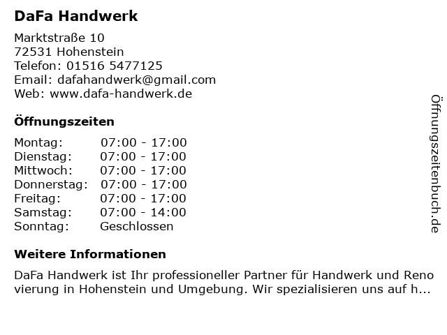 | Öffnungszeiten DaFa Handwerk in Hohenstein anzeigen | |