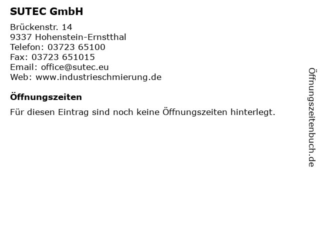 | Öffnungszeiten SUTEC GmbH in Hohenstein-Ernstthal anzeigen | |