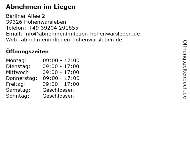 | Öffnungszeiten Abnehmen im Liegen in Hohenwarsleben anzeigen | |