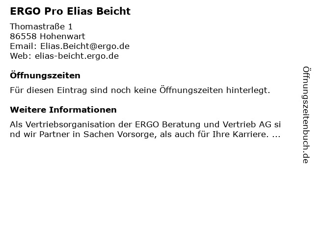 | Öffnungszeiten ERGO Pro Elias Beicht in Hohenwart anzeigen | |