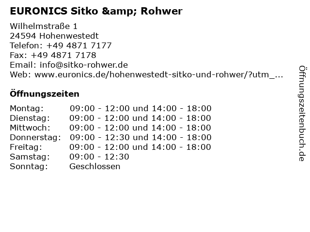| Öffnungszeiten EURONICS Sitko & Rohwer in Hohenwestedt anzeigen | |