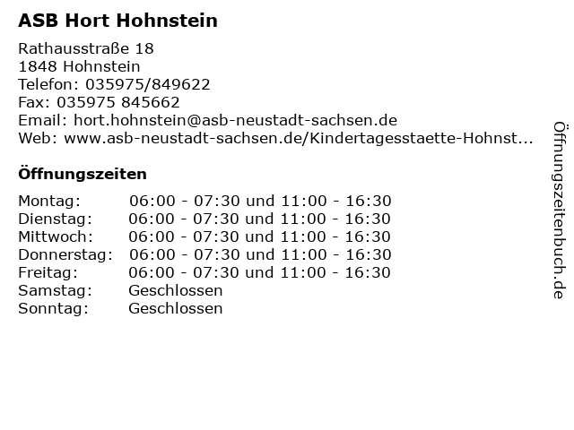 | Öffnungszeiten ASB Hort Hohnstein in Hohnstein anzeigen | |