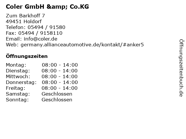 | Öffnungszeiten Coler GmbH & Co.KG in Holdorf anzeigen | |