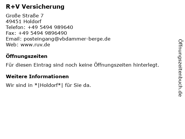 | Öffnungszeiten R+V Versicherung in Holdorf anzeigen | |