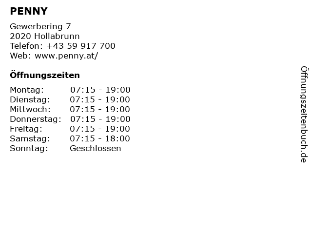 | Öffnungszeiten PENNY in Hollabrunn anzeigen | |