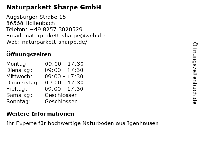 | Öffnungszeiten Naturparkett Sharpe GmbH in Hollenbach anzeigen | |