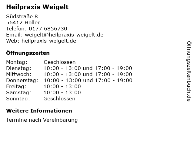 | Öffnungszeiten Heilpraxis Weigelt in Holler anzeigen | |
