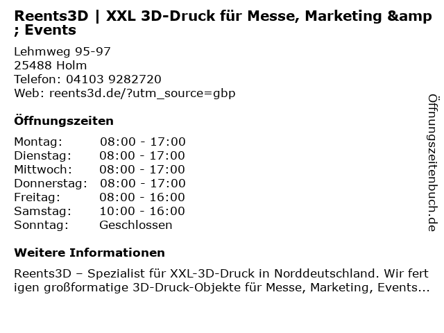 2 Reents Technologies GmbH | 3D Druck & CAD Konstruktion (Entfernung: 0,03 km) Osterbrooksweg 71, 22869 Schenefeld 6 |